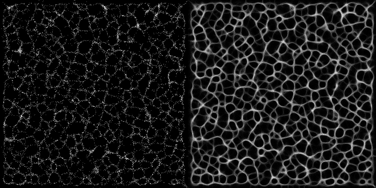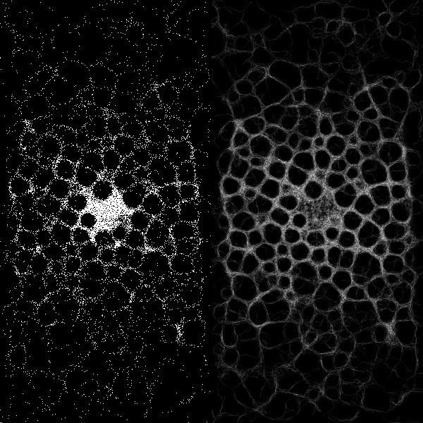 Inspired by works of Sage Jenson and Jeff Jones paper "Characteristics of pattern formation and evolution in approximations of physarum transport networks". Physarum polycephalum is an incredible myxomycete that organizes itself into these complex and visually pleasing networks. Based on a set of simple rules it's possible to model that behaviour and as in another famous celluar automata: Conway's Game of Life, uncover suprising complexity emerging from simplicity.