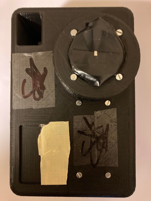 At first I decided to start with a lenseless pinhole camera for simplicity of the design and to reduce the cost (lenses are expensive). Over time I actually started enjoying the esthetic of pinhole camera photos and experimenting with different multipinhole setups. To create a pinhole optics I cut out a piece of metal and puctured the smallest hole I could in the center of it. Then I taped it on top of the lens mount of RPiHQ camera. I used a thick electrical tape to endure no light leaks (this is very important).