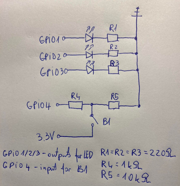 I designed a control board for trigger button and indicator LEDs. 3 LEDs were planned: "power on", "exposing" and "out of film". The control board is connected directly to GPIOs/3.3V/GND of the RPi. Below is a quick schematics for the control board, some of the resistance values might not be super accurate. I use 3 220[Ohm] resistors to limit LED currents (R1,R2,R3) and a 1[kOhm] protective resistor (R4) in series for the input GPIO and a 10[kOhm] pull-down resistance (R5) for the input GPIO.
