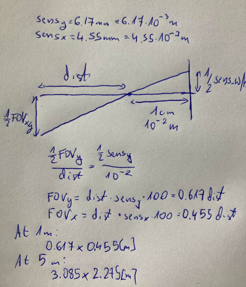 One of the problems I encountered is that the size of the sensor is quite small (6.17[mm]x4.55[mm]). Due to dimensions of the lens mount element, the pinhole was placed +-1[cm] away from the sensor and this results in quite narrow field of view (see calucations below). Due to narrow field of view it's fairly hard to aim the camera.