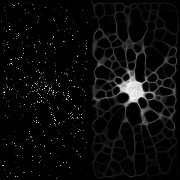 Inspired by works of Sage Jenson and Jeff Jones paper "Characteristics of pattern formation and evolution in approximations of physarum transport networks". Physarum polycephalum is an incredible myxomycete that organizes itself into these complex and visually pleasing networks. Based on a set of simple rules it's possible to model that behaviour and as in another famous celluar automata: Conway's Game of Life, uncover suprising complexity emerging from simplicity.